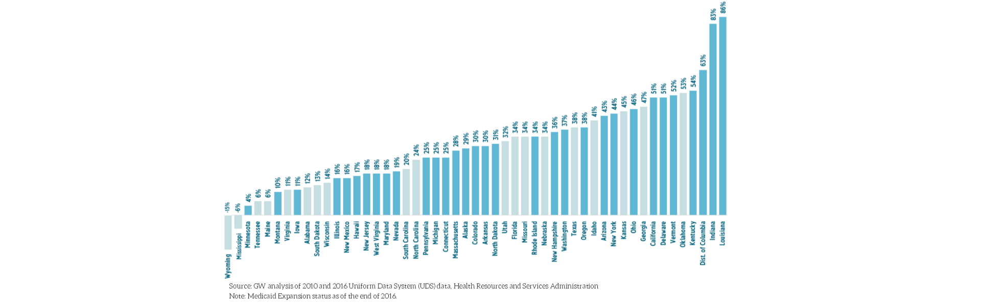 Both the Affordable Care Act’s (ACA) Medicaid expansion and non-expansion states were among those whose health centers experienced the highest patient growth, whether measured in terms of the number of patients served or percentage of patient growth. Although adoption of the ACA Medicaid expansion has been shown to be a significant factor associated with health center growth, non-Medicaid expansion states such as Texas and Florida also have experienced a major surge. The fact that this surge reached all states underscores the role played by the Affordable Care Act’s health center fund, which was most recently extended by Congress in the Balanced Budget Act of 2018.